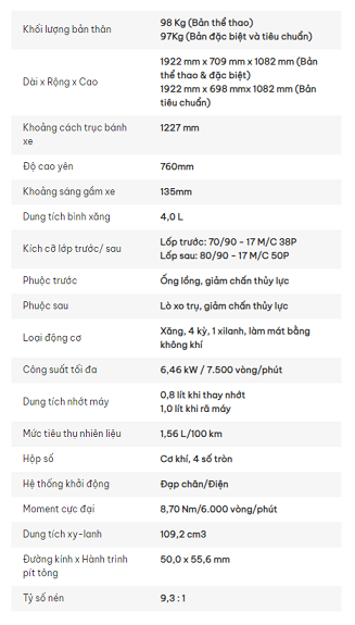 Hệ thống phun xăng điện tử PGM-FI được trang bị trên tất cả phiên bản, cung cấp lượng nhiên liệu phù hợp với điều kiện vận hành & giúp tiết kiệm nhiên liệu (mức tiêu thụ nhiên liệu chỉ 1,56l/100km)